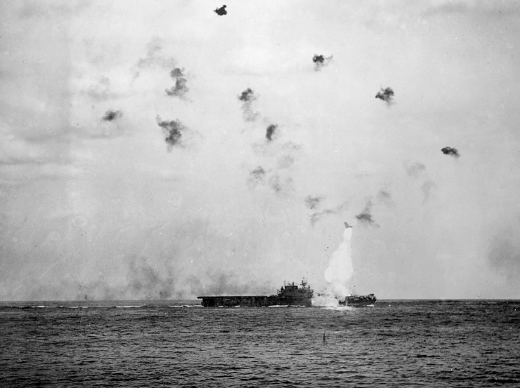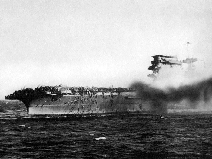 어뢰를 투하하고 날아가는 뇌격기와 그대로 내리꽃는 폭격기, 기울어진 상태로 대공포를 발사하며 마지막 저항을 해보는 호넷